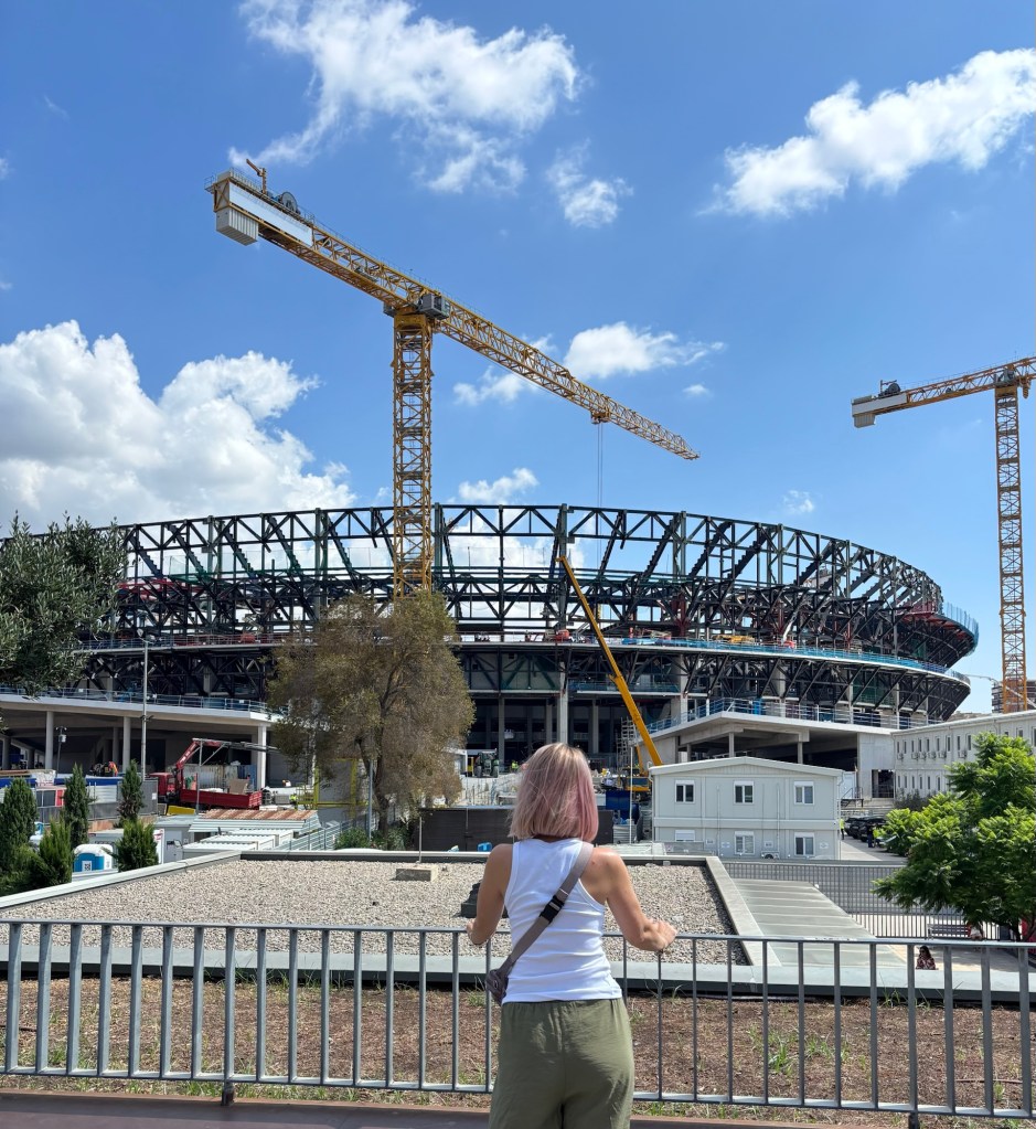 Sam stadion przechodzi przebudowę, więc nie weszliśmy na płytę boiska. Natomiast z punktu widzenia budowlańca było to bardzo miłe doświadczenie. Na dodatek akurat montowali konstrukcję stalową, więc z przyjemnością zerkałam, co tam się dzieje. Niestety, nie odważyłam się podejść do dwóch gentlemanów w białych kaskach, którzy siedzieli niedaleko nas podczas naszego późnego śniadania i trzymali wydruki rysunków, które moje krótkowzroczne oko sklasyfikowało jako plan montażu. Ale w końcu – to były wczasy!